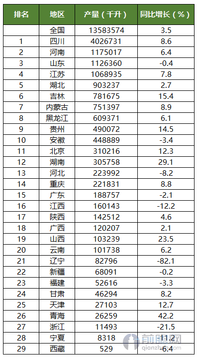 2016年全國白酒(折65度)總產(chǎn)量為135.84億升,同比上漲3.5%。其中四川省白酒年產(chǎn)量402.67萬千升,增長8.65%,位居全國第1位;河南省白酒產(chǎn)量117.50萬千升,增長6.4%,位居全國第2位;山東省白酒年產(chǎn)量112.64萬千升,下降0.4%,位居全國第3位。